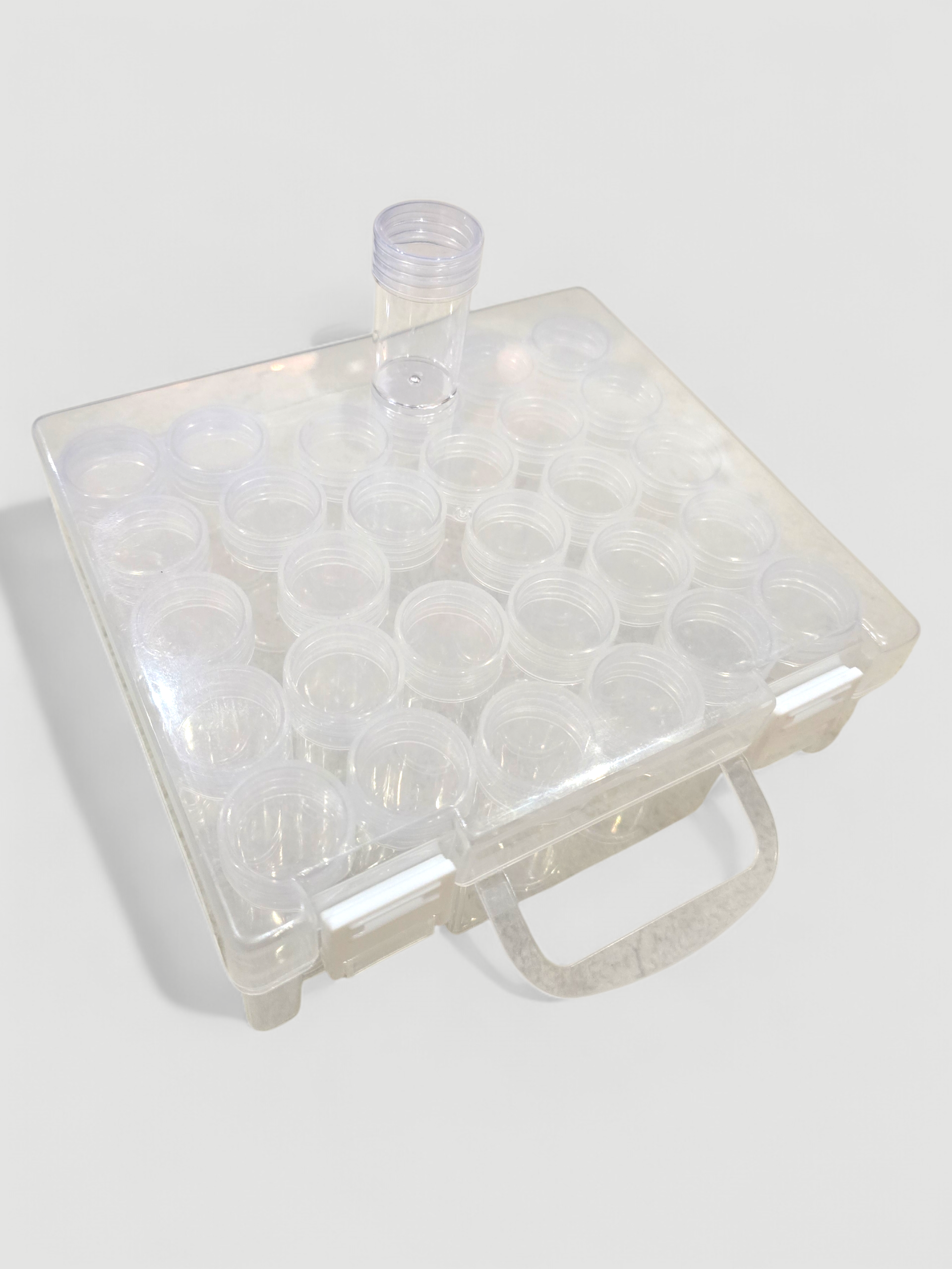 Diese robuste Kunststoffbox bietet Platz für 30 einzelne Döschen zur sicheren und übersichtlichen Aufbewahrung deiner Diamond Painting Steinchen. Jedes Döschen ist transparent, leicht zu öffnen und ideal für kleine Bastelmaterialien wie Strasssteine, Perlen oder Glitzer. Der stabile Tragegriff und die zuverlässigen Verschlüsse machen die Box zum idealen Begleiter für unterwegs oder im Atelier. Ordnung mit Stil – für kreative Köpfe, die gerne den Überblick behalten.