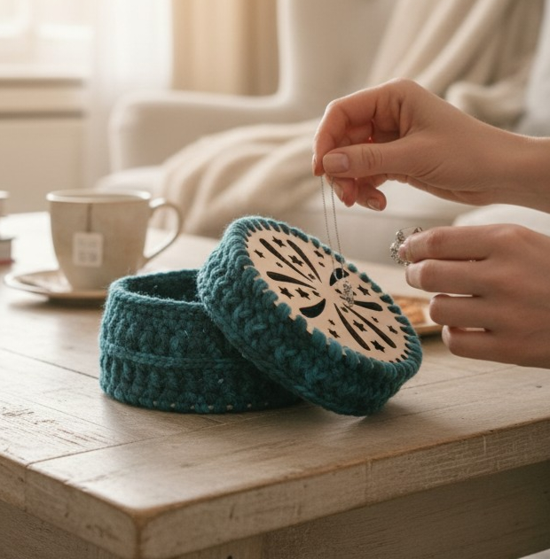 Diese liebevoll handgefertigte Aufbewahrungsdose verbindet weiche Häkelkunst mit natürlicher Holzmagie. Der Korpus wird aus hochwertigem Garn sorgfältig gehäkelt und misst 15 cm im Durchmesser – stabil, formschön und angenehm griffig.