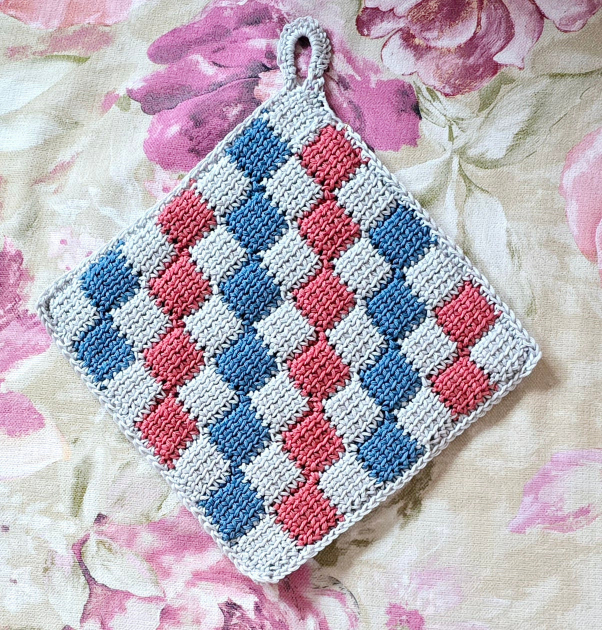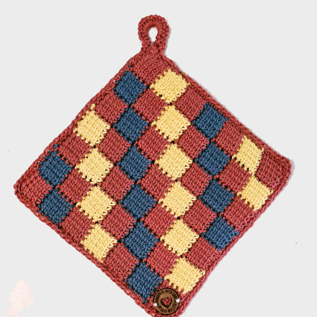 Dieser Topflappen wurden aus 100% Baumwolle in der Entrelac-Technik gehäkelt. Er ist doppellagig, das Muster erscheint also auch auf der Rückseite. Er ist ca. 20 x 20 cm groß und mit einem Henkel ausgestattet.