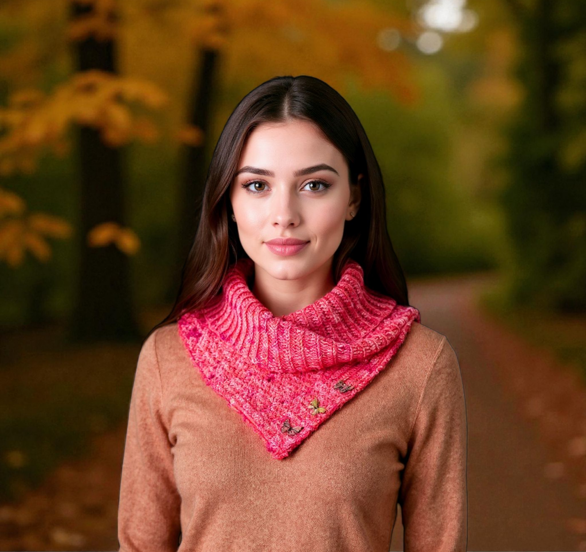 Dieser handgehäkelte Halswärmer aus hochwertiger Superfine Merinowolle vereint Funktion und Ästhetik auf charmante Weise. Die dreieckige Form sorgt für optimalen Sitz und angenehme Wärme an kühlen Tagen. Als liebevolles Detail dienen kleine Holzknöpfe in Schmetterlingsform – ein verspielter Akzent, der Naturverbundenheit und Handwerkskunst verbindet.