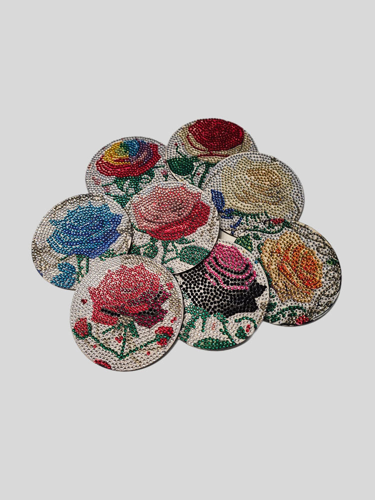 Untersetzer aus Holz mit Korkboden inkl. Untersetzerhalter. Die Untersetzer wurden von Hand mit Diamond Arts Steinchen verziert und anschließend versiegelt. Schöne Geschenkidee.