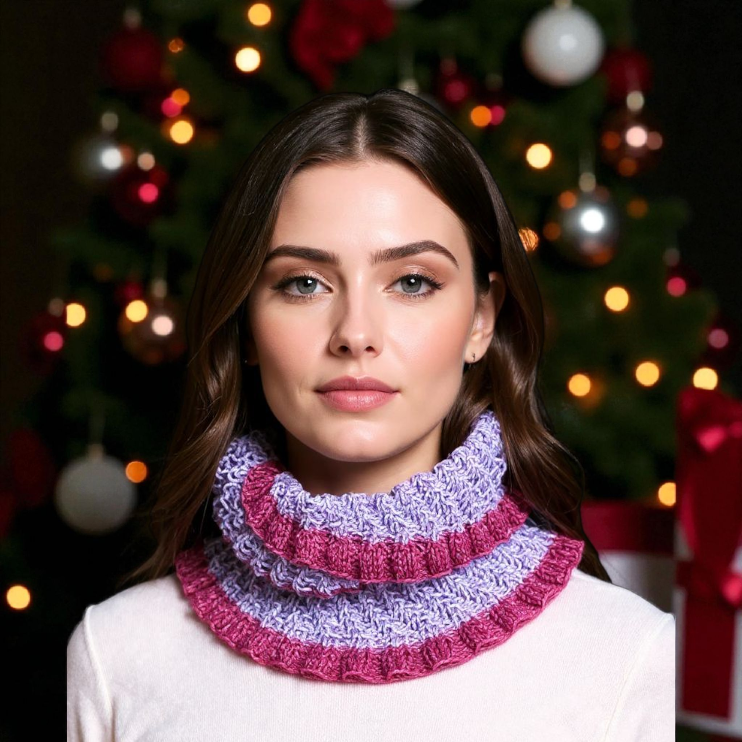Ein sanfter Kreis, der nie endet – dieser Möbius-Schalkragen aus feinster Merinowolle umhüllt dich wie ein leiser Wintergruß. Die zarten Farbnuancen von Flieder und Beere tanzen in harmonischen Streifen, während die weiche Rippenstruktur sich anschmiegt wie ein liebevoller Mantel aus Geborgenheit.