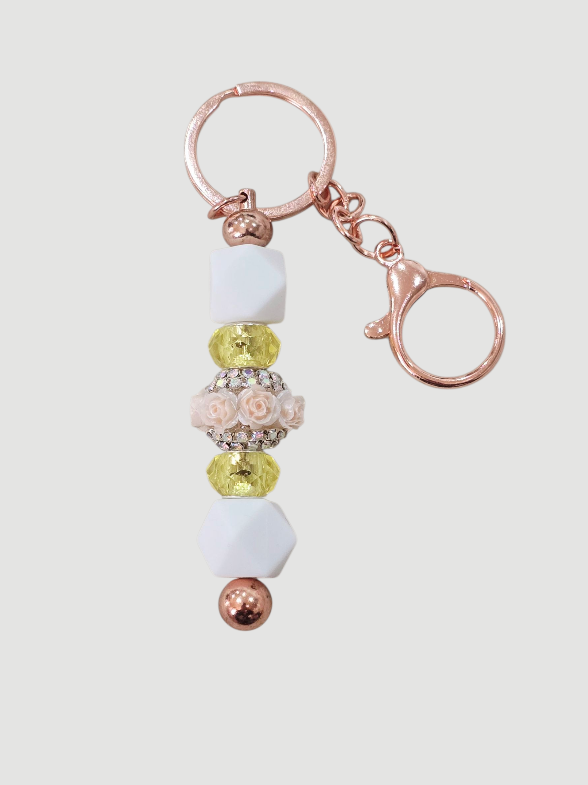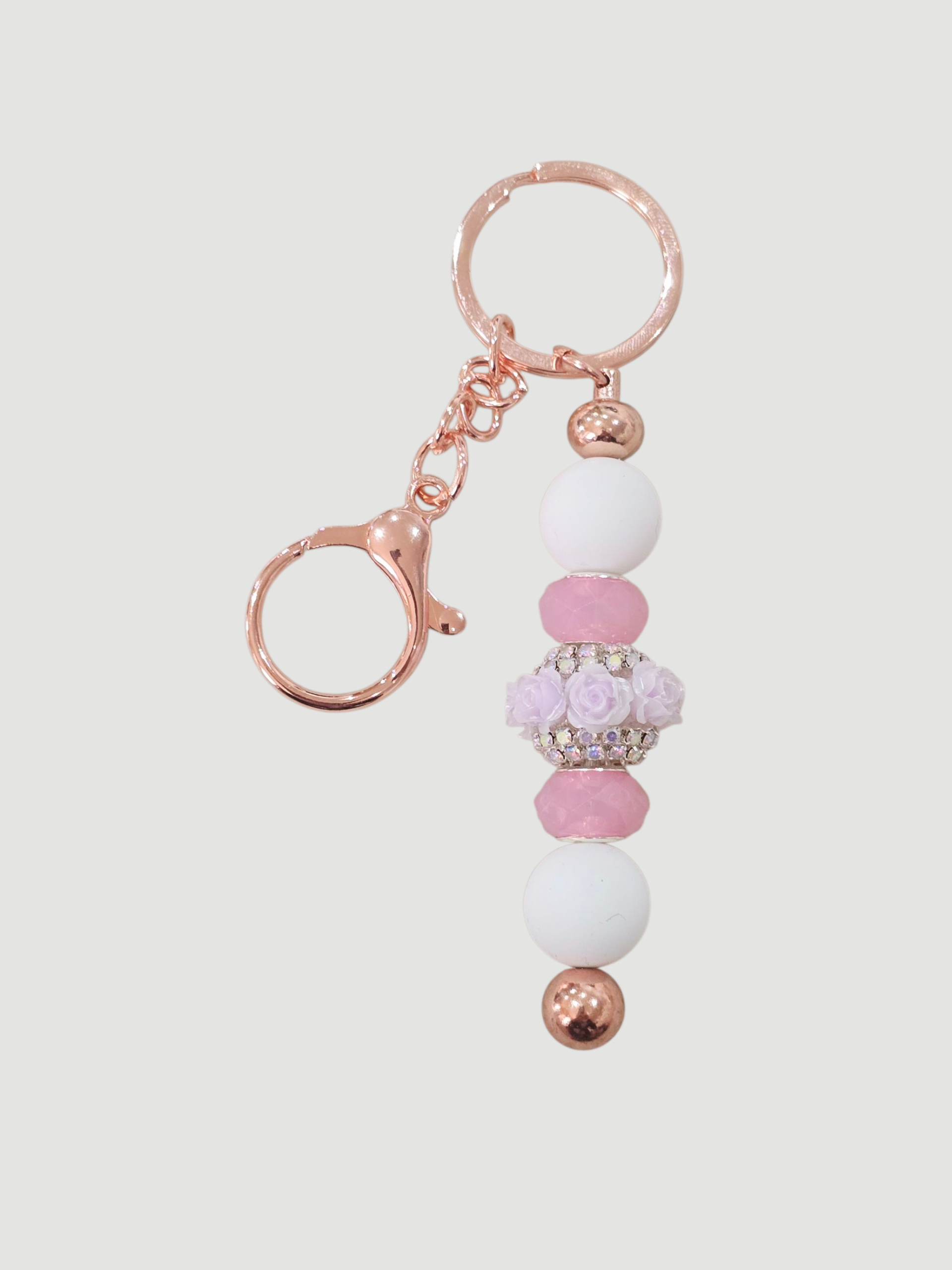 Ein kleines Schmuckstück für den Alltag: Dieser handgefertigte Schlüsselanhänger vereint verspielte Formen mit edlem Glanz. Die Kombination aus verschiedenen Perlen und zarten Blütenmotiven verleiht ihm eine besondere Ausstrahlung – feminin, elegant und liebevoll arrangiert.